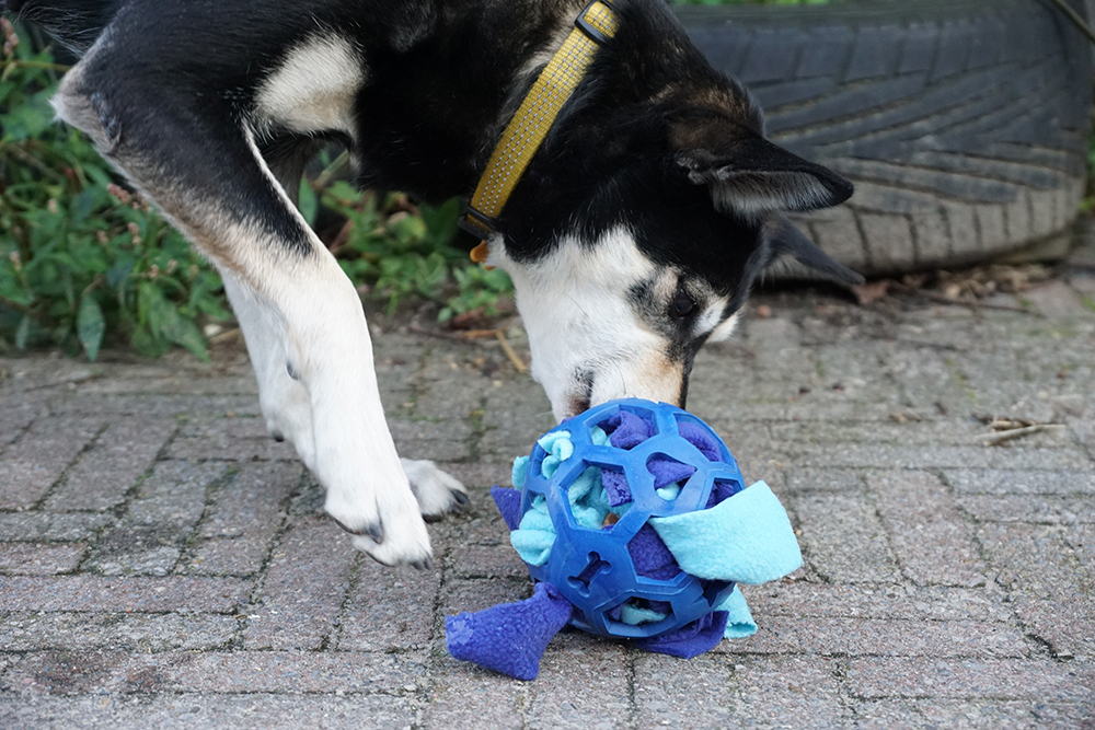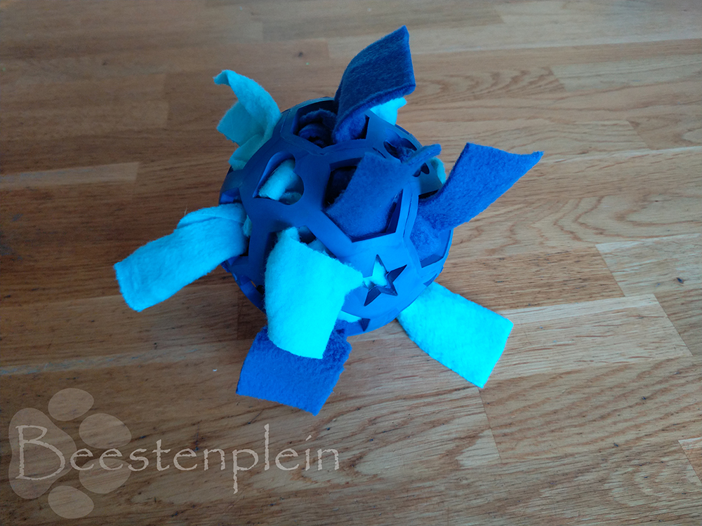 This hollow ball is filled with short strips of fleece, in which you can place sweets. Your dog can figure out how to get the rewards out by rolling, pulling and chewing. A fantastic brainteaser!