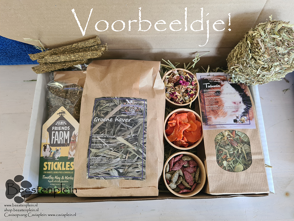 De box bestaat uit een bodem heerlijk hooi, een kruidenrol en vezel-sticks.