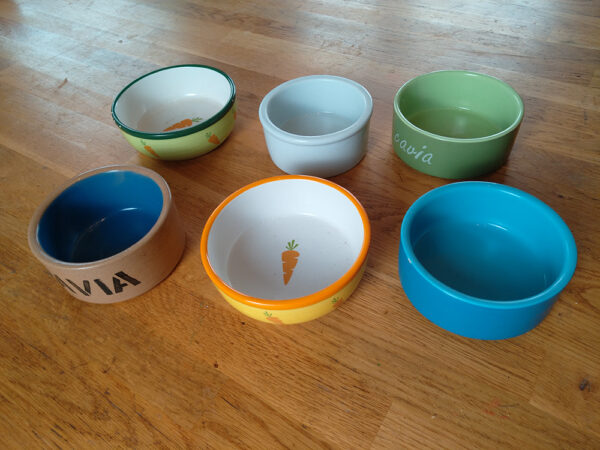 Voerbakjes van verschillende formaten in verschillende printjes.